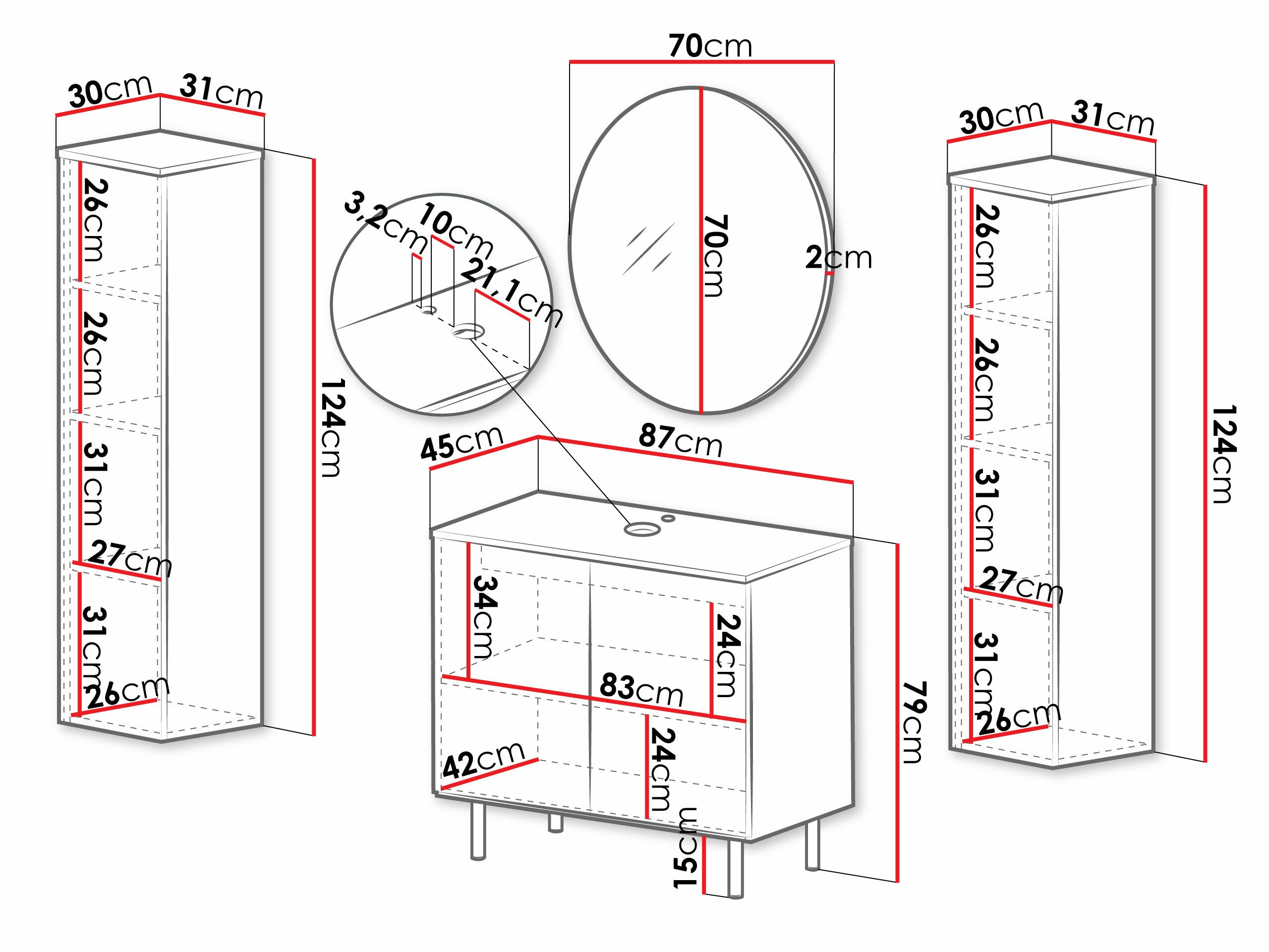 Informations sur la fixation au mur. Les meubles suspendus ou fixés au mur ne sont pas livrés avec des vis de fixation, vous devez donc vous en occuper individuellement. Les différents types de murs nécessitent des vis spécifiques, voire des profondeurs de perçage différentes. Choisissez le matériel de fixation en fonction du poids du meuble et du type de mur (cloison sèche, maçonnerie, bois, etc.). Pour garantir la qualité et la sécurité, utilisez des vis conçues spécifiquement pour votre type de mur.