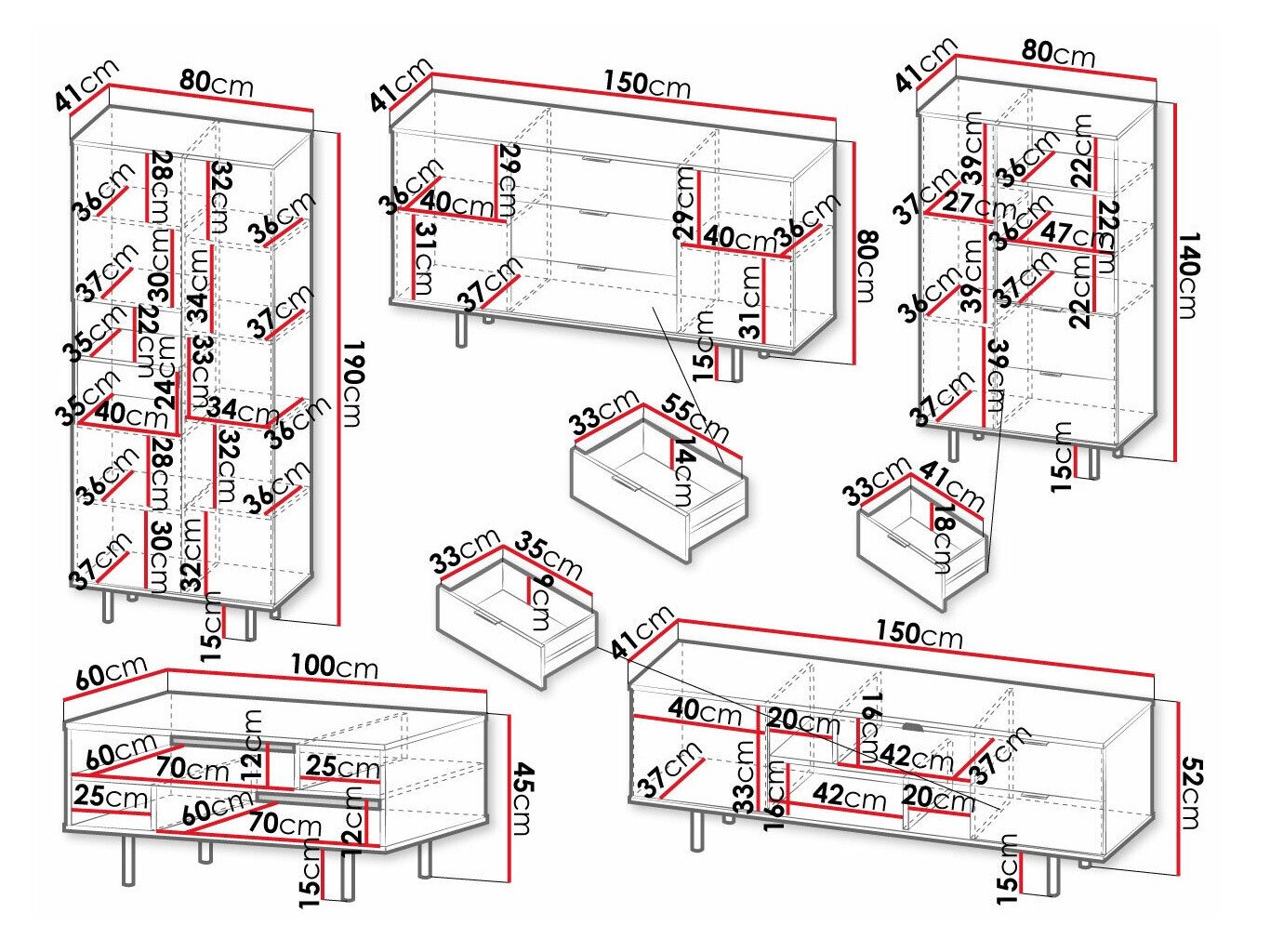 Informations sur la fixation au mur. Les meubles suspendus ou fixés au mur ne sont pas livrés avec des vis de fixation, vous devez donc vous en occuper individuellement. Les différents types de murs nécessitent des vis spécifiques, voire des profondeurs de perçage différentes. Choisissez le matériel de fixation en fonction du poids du meuble et du type de mur (cloison sèche, maçonnerie, bois, etc.). Pour garantir la qualité et la sécurité, utilisez des vis conçues spécifiquement pour votre type de mur.