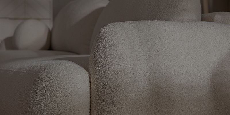 Le tissu présente un motif texturé unique, créé par des boucles et des nœuds de différentes tailles. Ce trait distinctif apporte aux meubles un caractère exceptionnel et une note douillette.