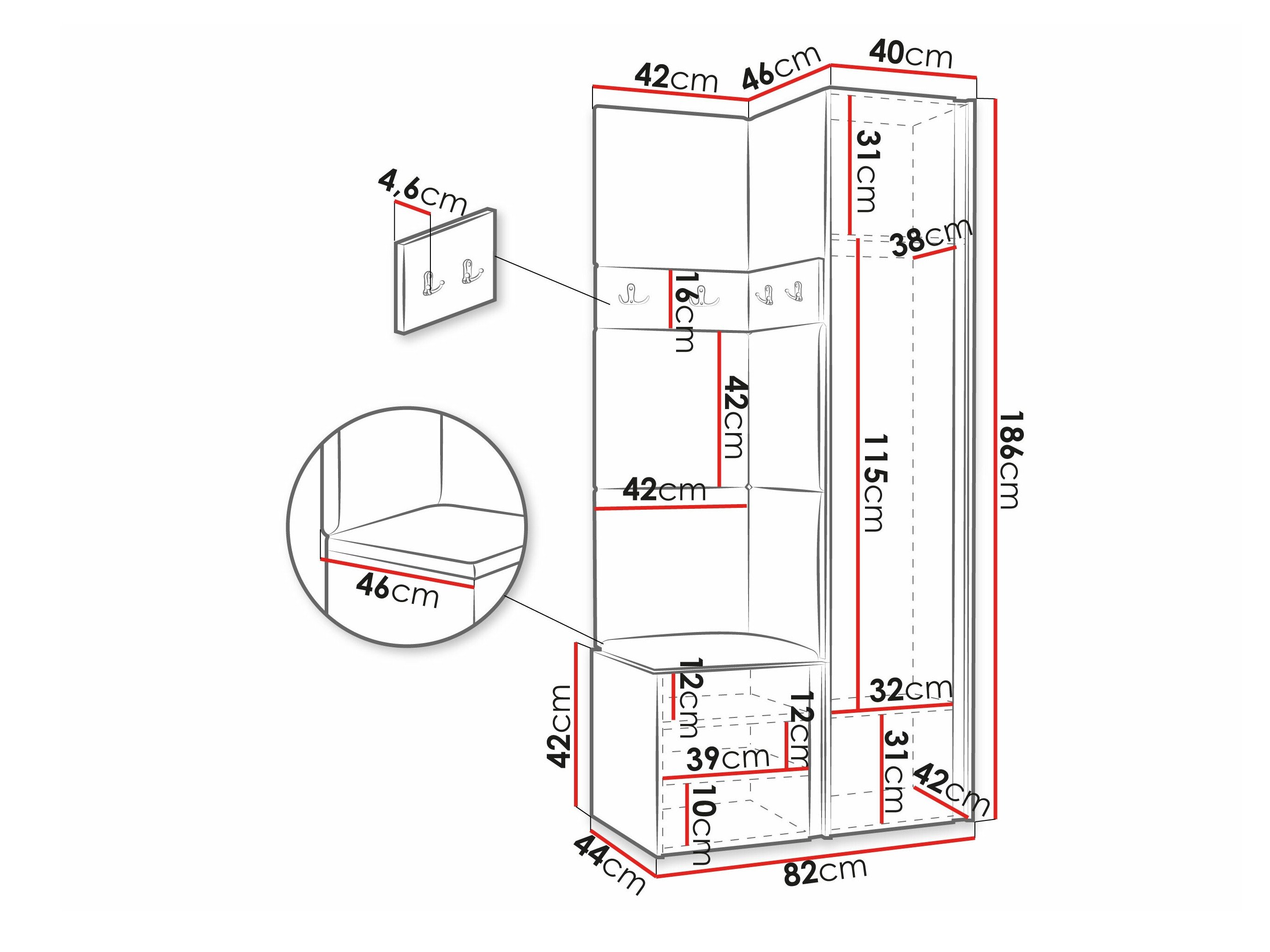 186 cm  42 cm  46 cm