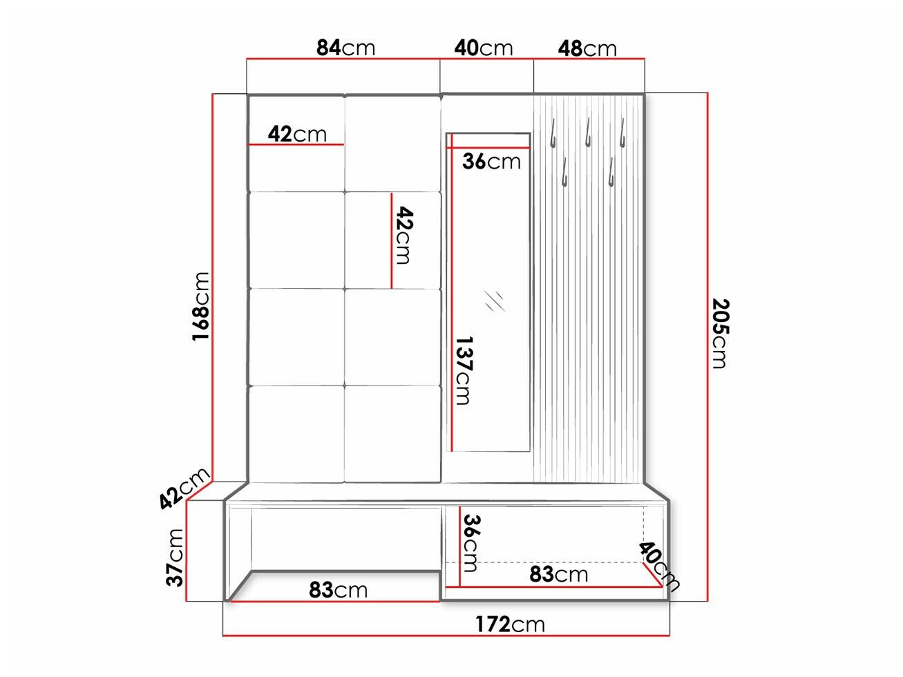 205 cm  172 cm  42 cm