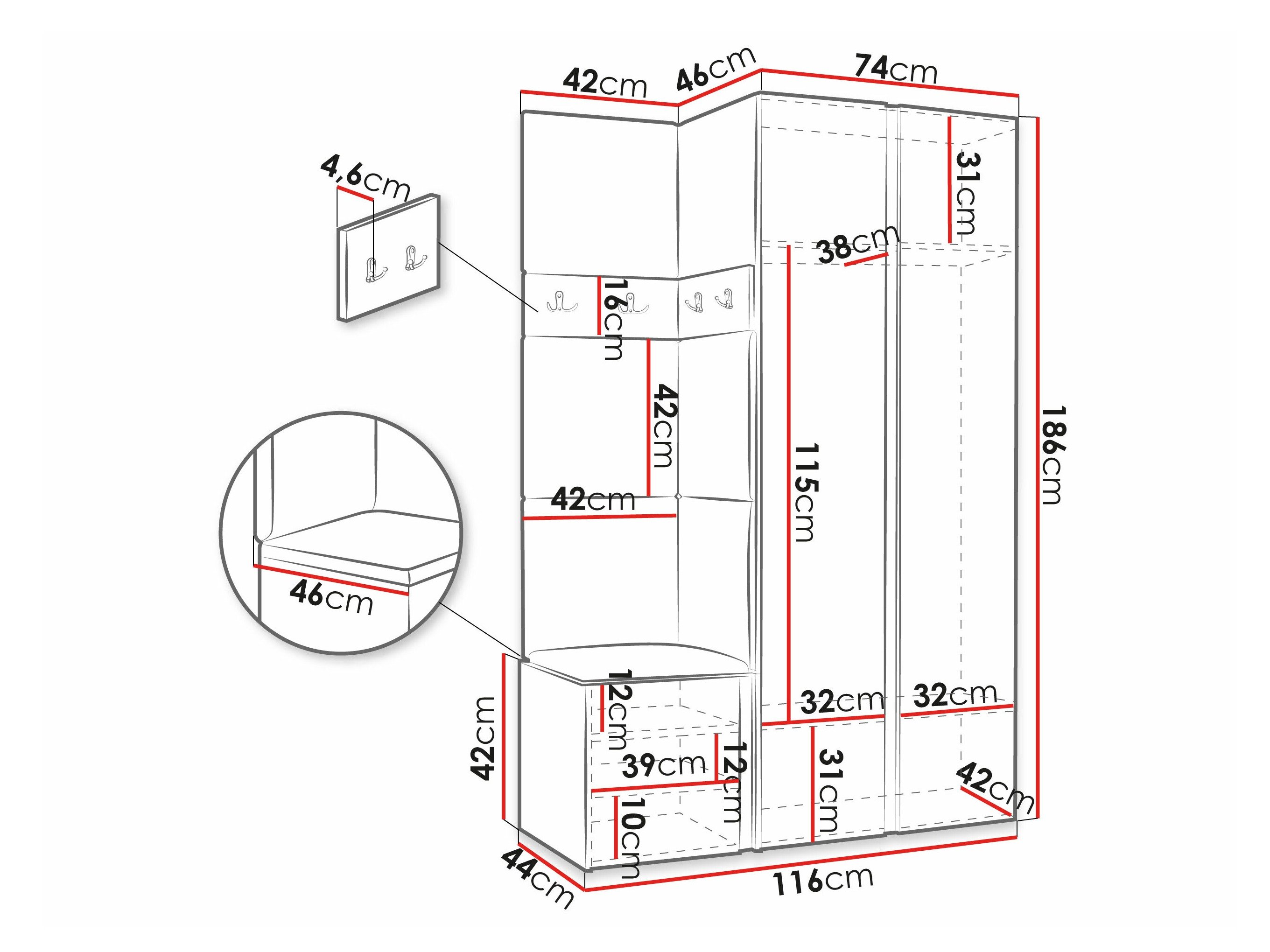 186 x 74 x 46 cm