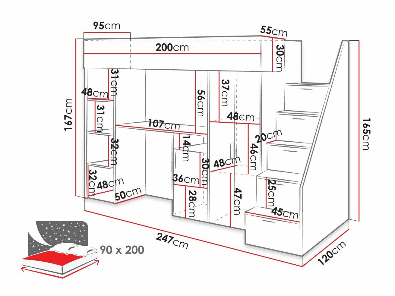 - 90 x 200 cm