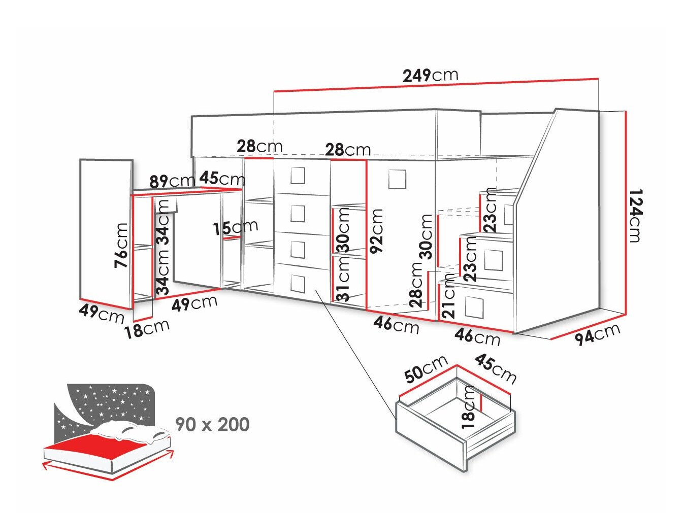 - 90 x 200 cm