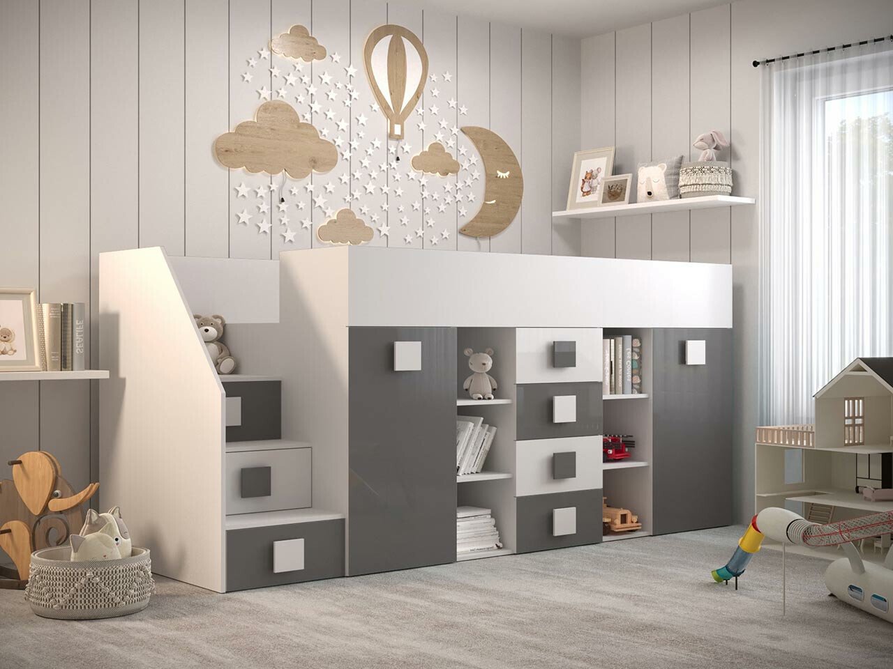 Lit mezzanine Hartford 366 (Blanc + Gris brillant + Blanc brillant)