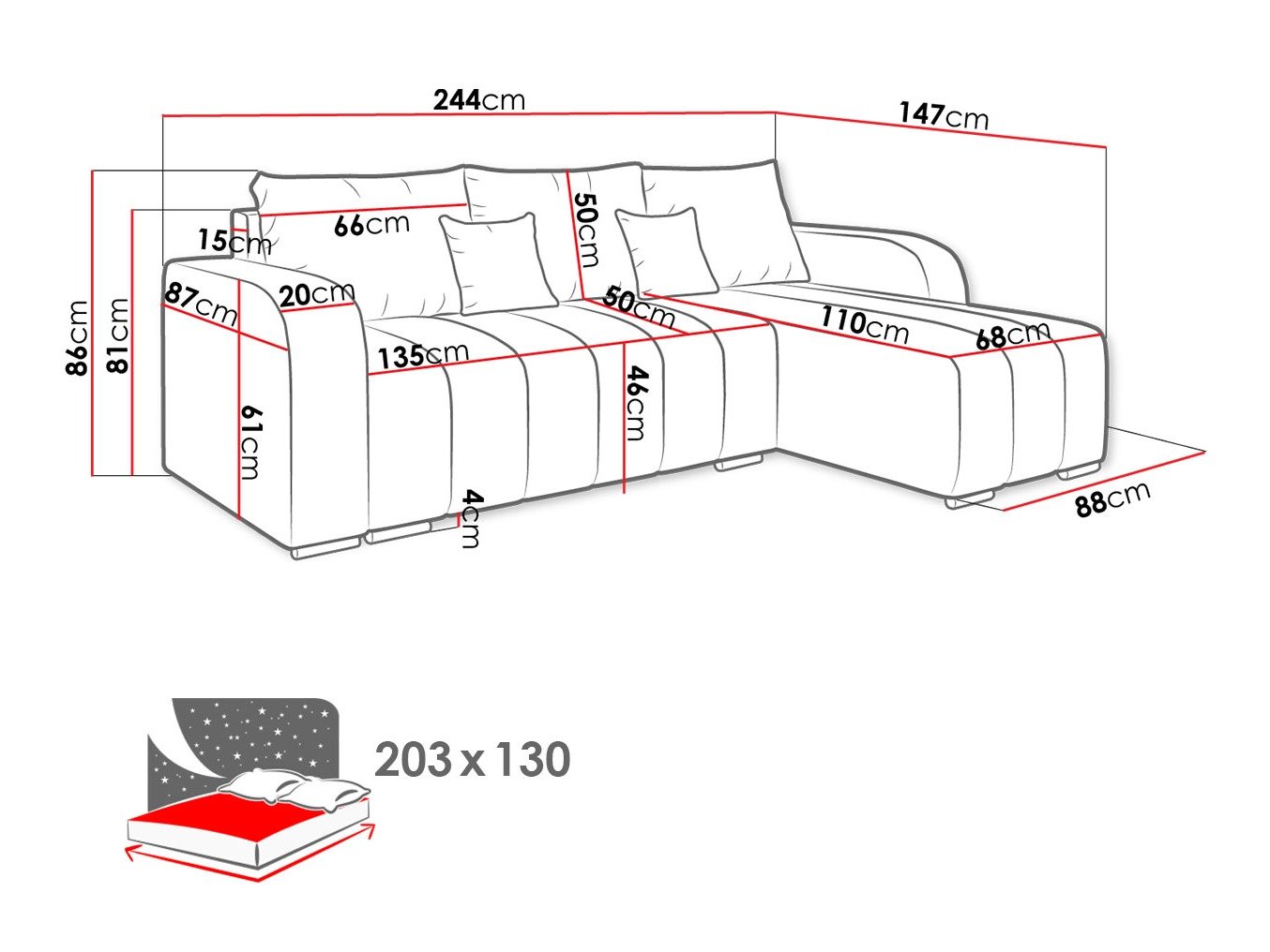 Longueur de la zone de couchage: