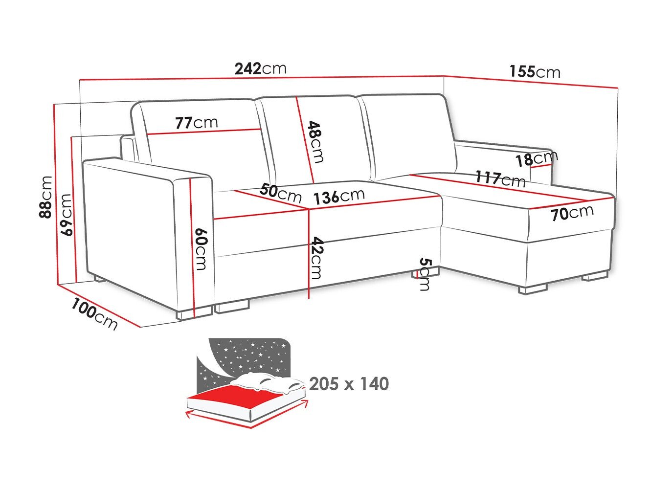Dimensions de la boîte à literie: