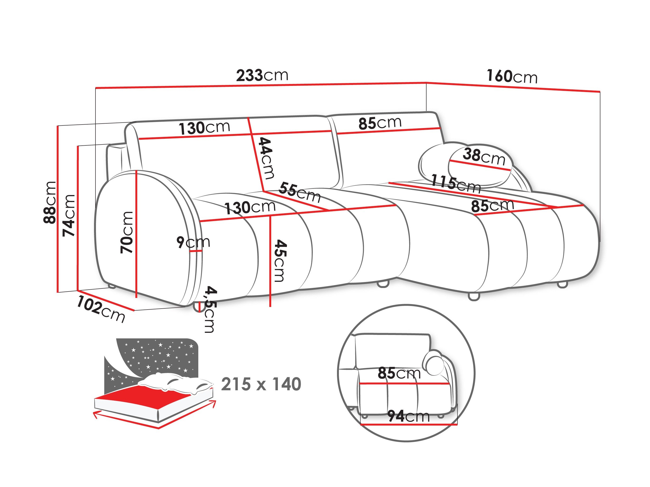 Largeur de la zone de couchage: