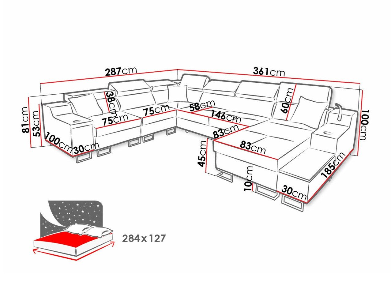 19 x 180 x 72; 19 x 97 x 72 cm
