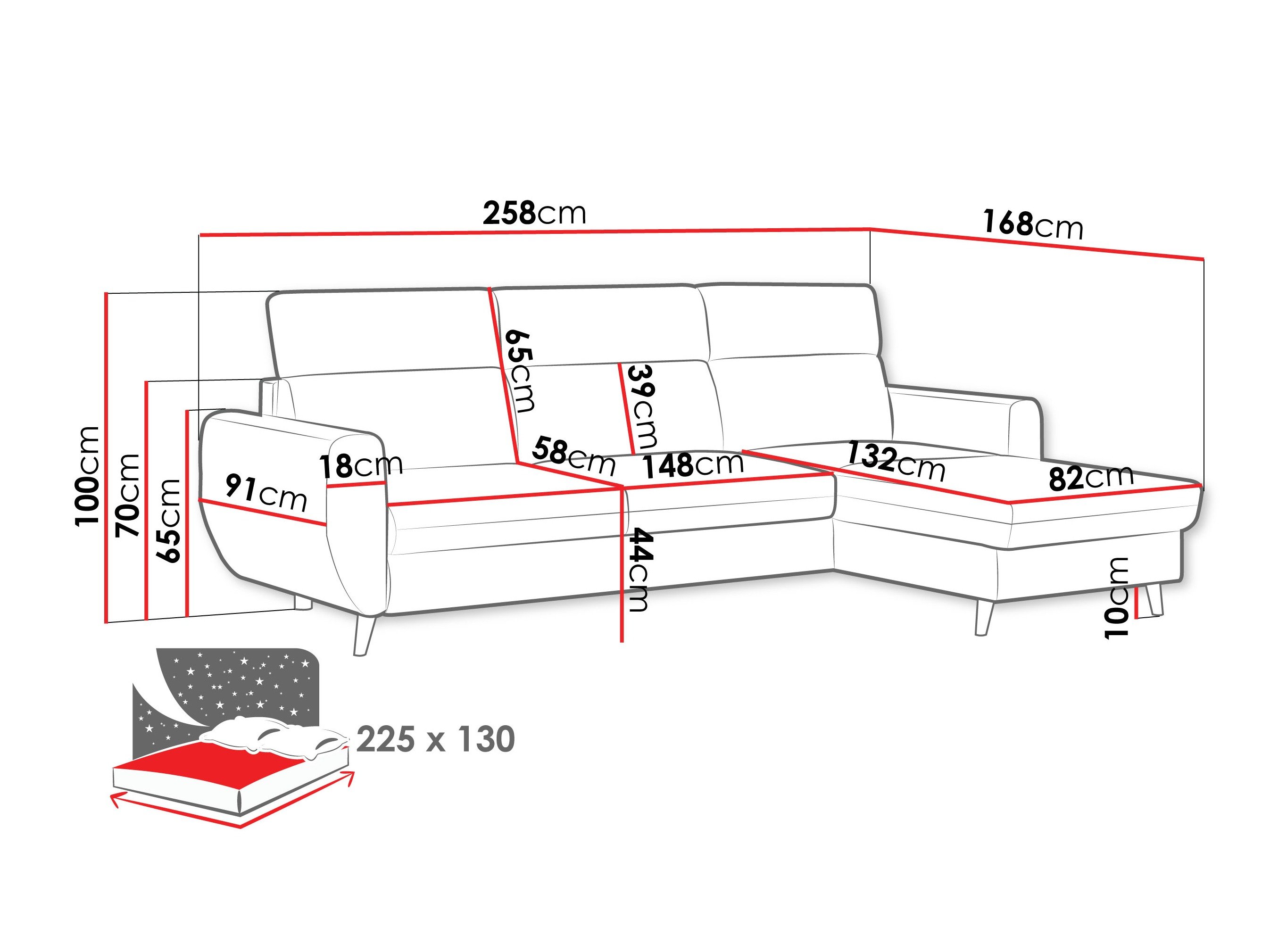 70 cm  258 cm  168 cm