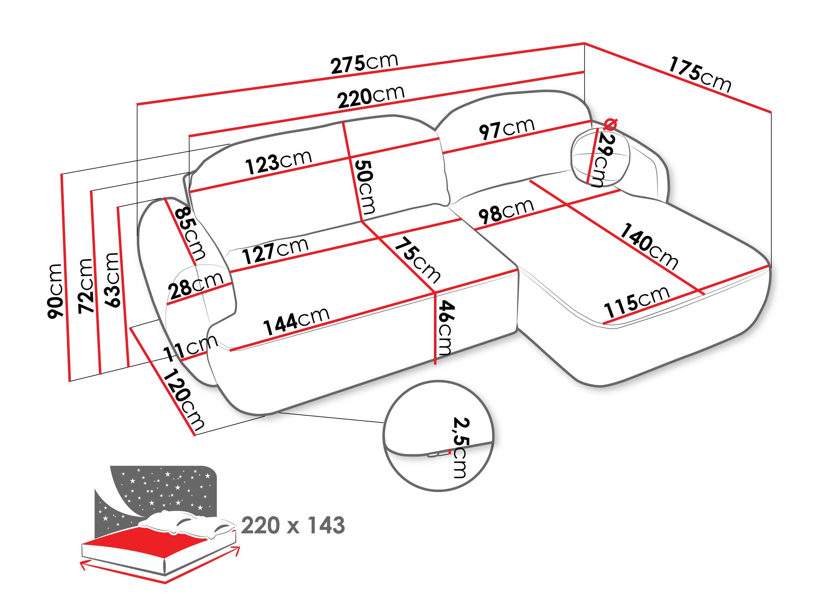 Longueur de la zone de couchage: